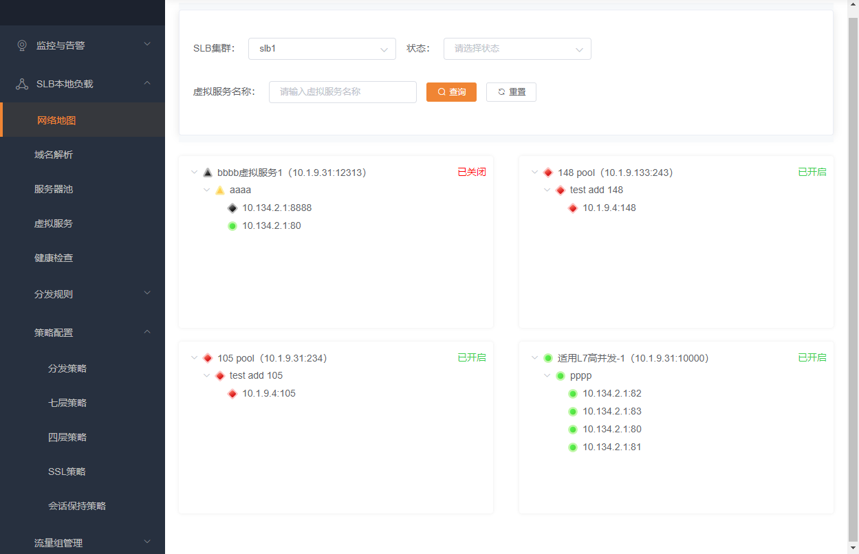 包含虚拟服务、服务器池与服务器节点,详见网络地图